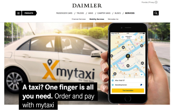 2009년 독일 함부르크의 작은 스타트업으로 시작한 세계 최초 택시앱 마이택시(회사명 : Intelligent Apps GmbH)는 2012년 벤츠를 만드는 다임러 사의 투자를 받기 시작했다. 2014년에는 100% 자회사로 편입되었다.