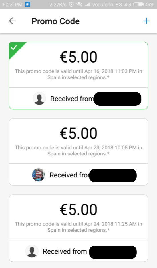 처음 가입할 때, 친구의 프로모션 코드를 입력하면 5~20 유로의 무료 쿠폰이 생긴다. 추천한 친구도 5~20 유로의 무료 쿠폰이 생긴다. 단, 신규로 가입하는 친구가 처음 신용카드를 입력하고 실제 사용 한 시점에 추천인에게 쿠폰이 발급된다.