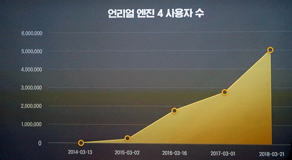 이에 따르면 발표일 기준 전세계 언리얼엔진 사용자는 최소 500만명으로, 2016년 기록한 300만명에 비해 167% 증가했다. 2015년 언리얼엔진 사용료가 전면 무료화된 이후 사용자가 계속해서 늘고 있다는 설명이다. 또한 2017년 스팀 총매출 4조3000억원 중 약 25% 이상을 언리얼엔진으로 만든 게임들이 차지했다. 박 대표는 “수년 전만 해도 언리얼엔진을 사용한 게임이 매우 적었다”며 “이제는 너무 많아서 발표자료에 다 집어넣지 못할 정도”고 말했다.
