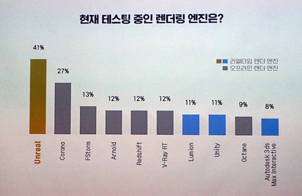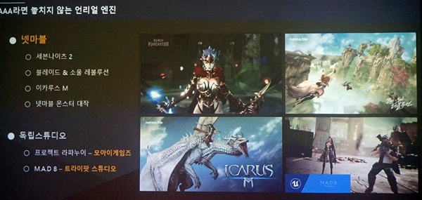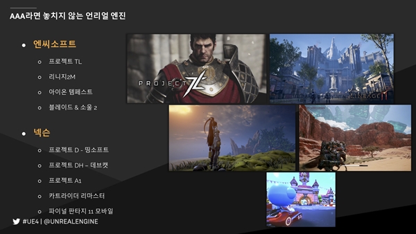 현재 엔씨소프트의 ‘프로젝트TL’과 ‘리니지2M’, 넥슨의 ‘프로젝트D’와 ‘파이널판타지11 모바일’, 넷마블의 ‘세븐나이츠2, 블레이드앤소울 레볼루션’ 등의 AAA게임들이 언리얼엔진으로 개발중이다. 박 대표는 “개인적으로 지난해 지스타에서 블레이드앤소울 레볼루션을 보고 깜짝 놀랐다”며 “PC 버전과 똑같게 구현해서 정말 인상 깊었다”고 말했다. 이어 “AAA게임뿐만 아니라 인디게임 개발자들에게도 많은 사랑을 받고 있다”며 “초기 비용이 전혀 들지 않기 때문”이라고 덧붙였다.