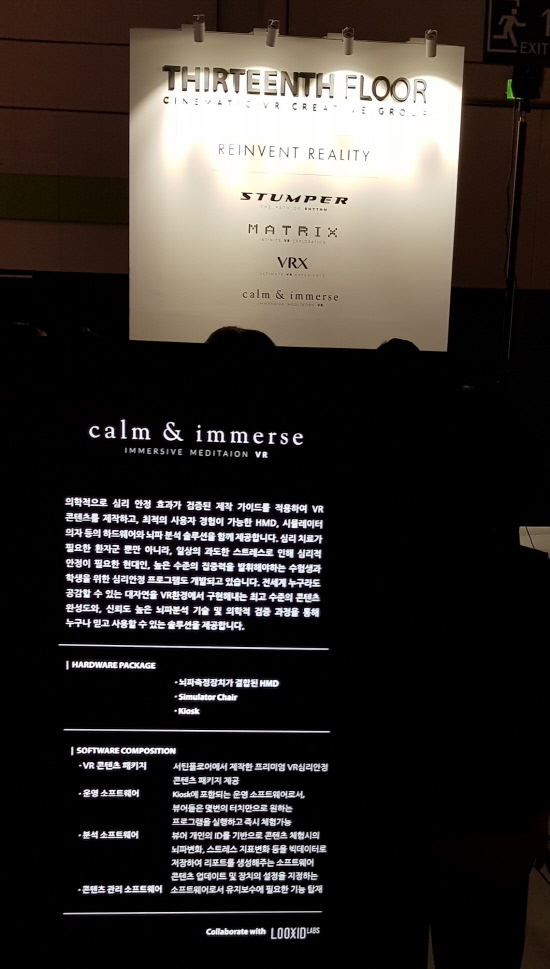 이번 행사에는 서틴플로어는 VR리듬 ‘스텀퍼(STUMPER)-시뮬레이터-뇌파측정을 통해 스트레스를 줄여주는 ’캄 & 이머스(calm & immerse)'-평면영상과 360VR이 자연스럽게 연결되면서 순간이동 체험을 주는 ‘매트리스 시네마’, 자체 브랜드 VRX 테마파크 등 다양한 작품을 출품했다. 체험과 테마파크, 병원 등B2B 시장을 겨누는 것이 대부분이다.