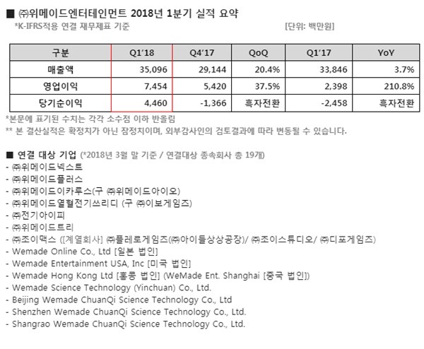 위메이드엔터테인먼트(대표 장현국)는 9일 2018년 1분기 실적을 발표했다.