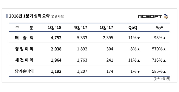 엔씨소프트(대표 김택진)는 2018년 1분기 실적 결산(연결기준) 결과 매출 4752억 원, 영업이익 2038억 원, 당기순이익 1192억 원을 기록했다고 10일 밝혔다.