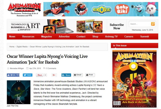오스카 상 수상 여배우 루피타 뇽오(Lupita Nyong’o)가 ‘잭과 콩나무 VR’에 찬사를 보냈다. 잭의 2회 안에서 자이언트 성우로 등장한 그는 “놀라운 VR기술로 두 가지의 아트 형식을 완벽하게 갖추었다”고 말했다.