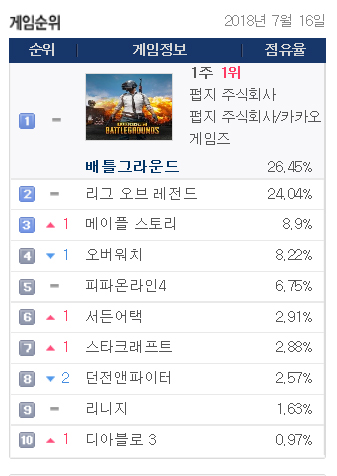게임트릭스에 따르면 7월 16일 기준 넥슨의 ‘메이플스토리’는 PC방 점유율 8.9%를 기록해 3위로 올라섰다. 블리자드의 ‘오버워치’는 8.22%를 기록, 4위로 내려앉았다. 두 게임의 점유율 차는 0.68%p다. 1위는 펍지의 ‘배틀그라운드’, 2위는 라이엇게임즈의 ‘리그오브레전드’가 차지했다.