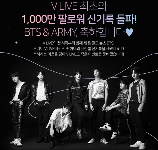 한편, 브이라이브는 방탄소년단 글로벌 1000만 팔로워 돌파를 기념해, 방탄소년단에게 축하와 응원의 메시지를 남긴 팬들 중 선정해, 코인을 제공하는 프로모션을 진행한다.