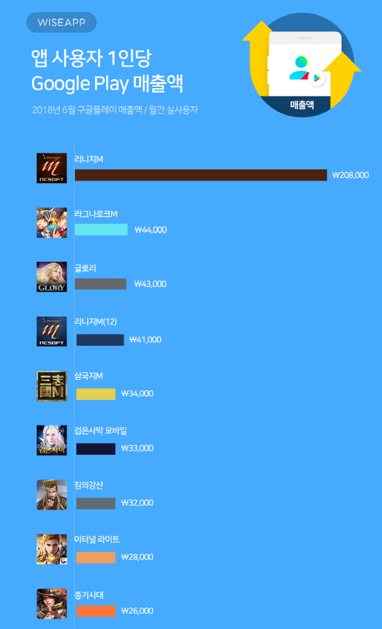 앱 분석 업체 와이즈앱에 따르면 2018년 6월 한국 구글플레이 결제 금액과 앱의 월간 사용자수를 조사한 결과 지난 6월 한 달 앱 사용자 1인당 매출액 1위는 ‘리니지M’으로 20만 8000원이었다.
