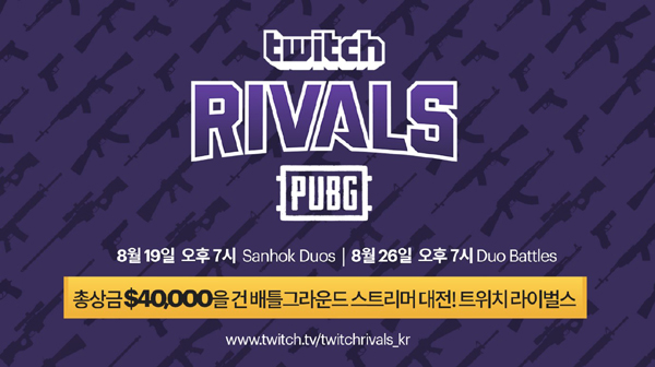 트위치 라이벌스는 배틀그라운드를 즐겨하고 트위치 방송 송출이 가능한 스트리머라면 누구나 참여 가능한 온라인 대회다. 오는 8월 19일 사녹 듀오, 8월 26일 듀오 배틀이 진행되며, 총 상금은 4만 달러 규모다. 상금은 각 라운드당 순위에 따라 배분된다.
