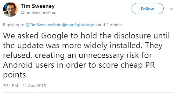 팀 스위니 대표는 24일(현지시각) “업데이트가 널리 퍼질 때까지 구글에 공개하지 말아달라고 요청했지만, 구글은 이를 거절했다”며 “이는 구글이 값싼 홍보 효과를 누리기 위해 사용자들을 불필요한 위험에 노출시킨 것”이라고 주장했다. 이어 “물론 그것이 효과적인 홍보전략이라는 점은 인정하지만, 왜 이렇게 빨리 기술적인 세부사항까지 발표했는지 모르겠다”고 덧붙였다.