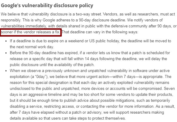 그러나 구글 취약점 공개 정책에 따르면, 구글은 90일 이전에도 해당 이슈를 공개할 수 있다. 구글은 정책 페이지를 통해 “우리는 취약점을 즉시 업체에 통보하고, 90일 후에는 대중에 세부 내용을 공개한다”며 “만일 업체가 해당 문제를 해결할 경우 공개일은 더 빨라질 수 있다”고 명시했다. 또한 “이전에 알려지지 않았고 해결되지 않은 취약점일 경우 7일 이내에 긴급한 조치를 취해야 한다고 생각하며, 우리는 사용자가 스스로 보호할 수 있도록 지원할 것”이라며 “더 많은 장치나 계정이 손상될 수 있기 때문”이라고 밝혔다.