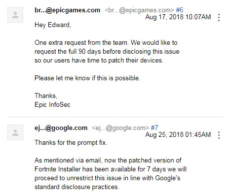 ‘포트나이트’의 취약점을 처음 제기한 ‘구글 이슈 트래커’에서도 같은 내용이 나온다. 구글은 에픽게임즈에 보낸 이메일 말미에 “이 버그에는 90일 공개 기한이 적용되지만, 패치가 널리 사용 가능해지면 (90일 이전에) 리포트가 대중에게 공개된다”는 내용을 언급했다.