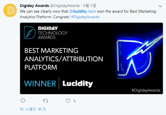 디지데이 테크놀로지 어워드(Digiday Technology Awards) 결과가 2018년 9월 5일 발표되었다. 이 발표에서 눈에 띄는 것은 루시디티(LUCIDITY)의 깜짝 수상이다.