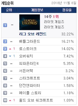 로스트아크는 9일 PC방 순위 분석 사이트 게임트릭스 기준 PC방 점유율 14.02%를 기록하면서 PC방 상위권 순위의 지각 변동을 예고하고 있다. 현재 전체에서는 3위, RPG 장르에서는 압도적인 1위를 달리고 있다. PC방 순위에서 MMORPG가 최상위권에 진입한 것은 오랜만이다.
