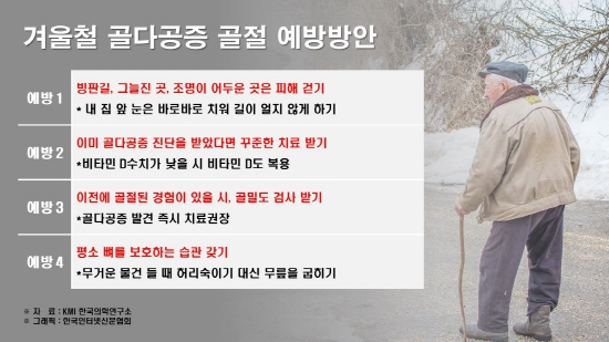 KMI 한국의학연구소는 겨울철 골다공증 골절 예방방안으로 다음과 같이 밝혔다.