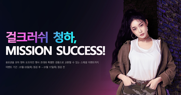 카리스마 넘치는 안무와 귀여운 매력으로 사랑 받고 있는 청하 캐릭터는 ‘걸크러쉬 폭발 댄스’, ‘애교 청하’, ‘도발 청하’ 등의 감정 표현 3종과 함께 실제 음성 효과를 지원한다. 또한, 캐릭터 사용 시 경험치 20% 증가 등 추가 기능을 갖는다.