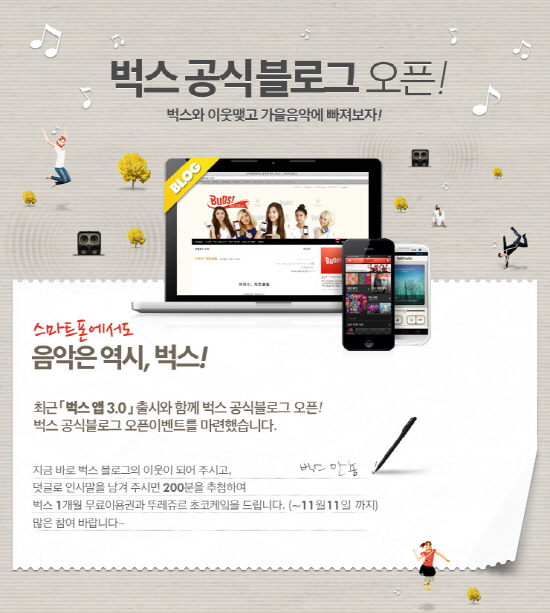 블로그 개설을 기념한 이벤트도 마련했다. 오는 11일(일)까지 벅스 블로그와 이웃을 맺은 뒤 덧글로 인사말을 남기면 추첨을 통해 200명에게 벅스 음악 상품권 및 뚜레쥬르 케이크 상품권을 제공한다.