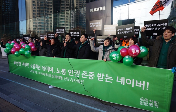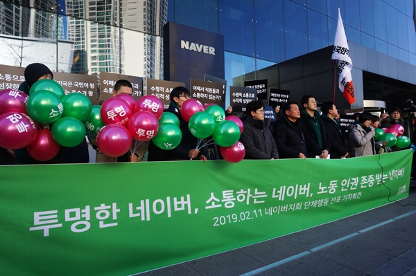 네이버 노조(민주노총 화학섬유식품산업노동조합 네이버지회)는 11일 성남시 분당구 네이버 본사 앞에서 기자회견을 열고 2월 20일 네이버 본사 1층 로비에서 첫 공식 쟁의행위를 시작한다고 밝혔다.