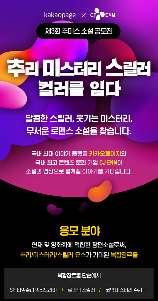 카카오페이지(대표 이진수)가 CJ ENM과 손잡고 ‘추미스(추리, 미스터리, 스릴러) 소설 공모전’을 개최한다. 이 공모전은 지난 해에 이어 올해로 3회째를 맞는다.