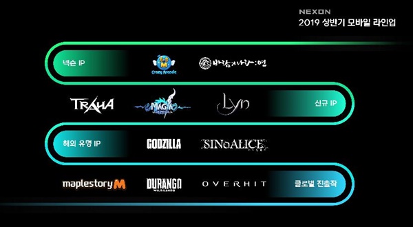 올해 1월부터 4개의 모바일게임을 연거푸 출시한 넥슨은 2019년 3월부터 6월까지 총 7개의 신작 모바일게임을 추가로 선보인다. 3월 14일 출시를 확정한 ‘린: 더 라이트브링어’를 시작으로 ▲‘크레이지아케이드 BnB M’ ▲‘트라하’ ▲‘고질라 디펜스 포스’ ▲‘바람의나라: 연’ ▲‘마기아: 카르마 사가’ ▲‘시노앨리스’를 차례로 출시한다.