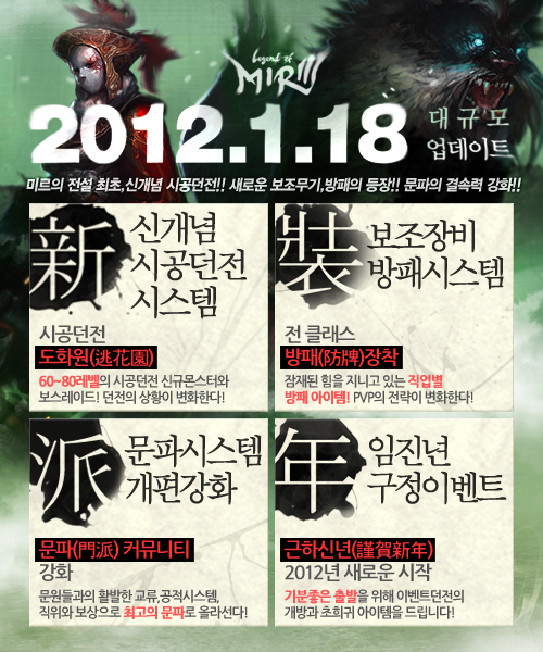 위메이드 엔터테인먼트(대표 박관호)가 개발, 서비스하고 있는 무협 MMORPG '미르의 전설3'(www.mir3.co.kr)는 18일 업데이트를 통해 '시공던전 도화원’ 업데이트와 문파시스템의 개편과 강화로 새해 첫 단추를 꿰었다.