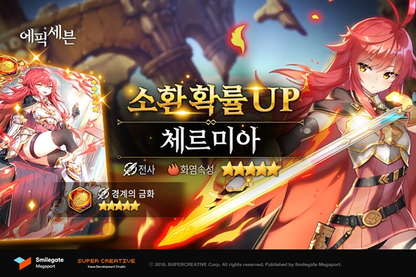 스마일게이트 메가포트(대표 장인아)가 서비스하고 슈퍼크리에이티브(김형석, 강기현 공동대표)가 개발한 모바일 턴제 RPG ‘에픽세븐’이 신규 영웅 ‘체르미아’를 업데이트 했다고 21일 밝혔다.