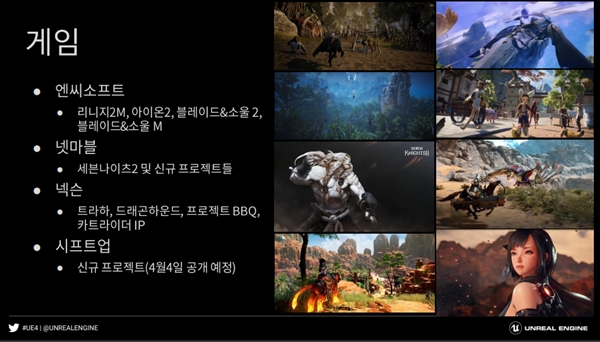 이날 행사에서는 언리얼 엔진을 이용해 개발중인 국내 개발사의 차세대 AAA급 게임들이 소개됐다. 엔씨소프트의 ‘리니지2M’, ‘아이온2’, ‘블레이드&소울2’, ‘프로젝트 TL’, 넷마블의 ‘세븐나이츠2’, 넥슨의 ‘트라하’, ‘드래곤하운드’, ‘프로젝트 BBQ’, ‘카트라이더’ IP 게임 등이 언리얼 엔진 4로 개발되고 있다. 시프트업의 신규 프로젝트 역시 언리얼 엔진 4를 이용했다. 에픽게임즈는 언리얼 엔진이 단순히 사용자가 많은 엔진을 넘어 실제 상업적인 성공으로 이어지는 대부분의 게임들에 사용되고 있다는 점을 강조했다.
