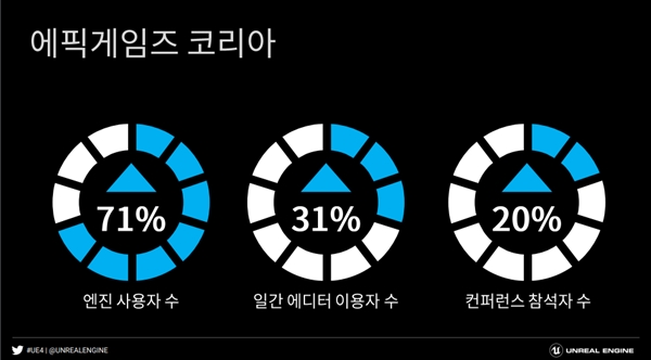 특히 한국 사용자 수가 지속적인 큰 폭의 증가세를 보였다. 지난해 언리얼 엔진을 사용한 국내 사용자는 2017년보다 71% 증가했으며, 하루 동안 해당 서비스를 이용한 순수한 이용자 수를 나타내는 지표인 DAU(Daily Active Users, 일간순수이용자)는 31%, 오프라인 컨퍼런스 참석자수 역시 20% 증가했다.