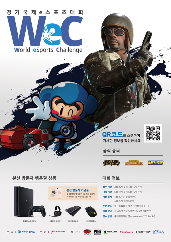 경기도는 오는 5월 11일부터 12일까지 양일간 2019 플레이엑스포(2019 PlayX4)가 열리는 킨텍스 특설무대에서 ‘월드 e스포츠 챌린지 2019(World E-sports Challenge. 이하 W.E.C)’를 연다고 8일 밝혔다. 국제 아마추어 e스포츠 대회를 여는 지자체는 경기도가 처음이다.