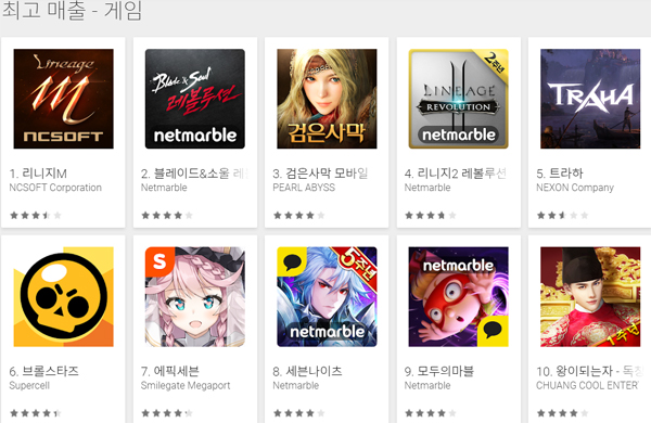 이로써 현재 구글 최고매출 1위부터 5위까지 모두 모바일 MMORPG가 장악했다. 기존 인기 MMORPG들의 경쟁에 ‘트라하’가 가세하면서 더욱 치열한 경쟁이 펼쳐지는 모양새다. 6위부터 10위까지는 모두 수집형 RPG이거나 실시간 대전게임, 보드 게임이다.