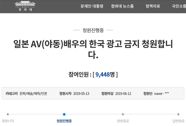 급기야 청와대 국민청원 홈페이지에는 “일본 AV(야동) 배우의 한국 광고를 금지해달라”는 청원까지 등장했다. 청원을 올린 네티즌은 “포털사이트 메인, TV, 영화관, 유튜브 등 모든 연령층이 볼 수 있는 공간에서 보여지고 있다”며 “광고를 보고 불쾌한 어른들은 물론, 유아동들의 성가치관에도 큰 영향을 줄 수 있는 일본 야동배우의 광고를 당장 금지해 달라”고 주장했다. 해당 청원에는 16일 오후 현재 1만 명에 육박하는 이들이 찬성한 상태다.