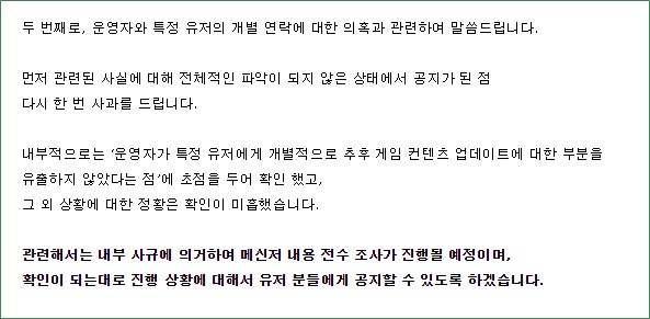 이 디렉터는 “운영자가 특정 유저에게 개별적으로 추후 게임 콘텐츠 업데이트에 대한 부분을 유출하지 않았다는 점에 초점을 두어 확인했고, 그 외 정황에 대해서는 확인이 미흡했다”며 “이와 관련해 내부 사규에 의거하여 메신저 내용 전수 조사가 진행될 예정이며, 확인이 되는 대로 진행 상황에 대해서 공지하겠다”고 밝혔다.