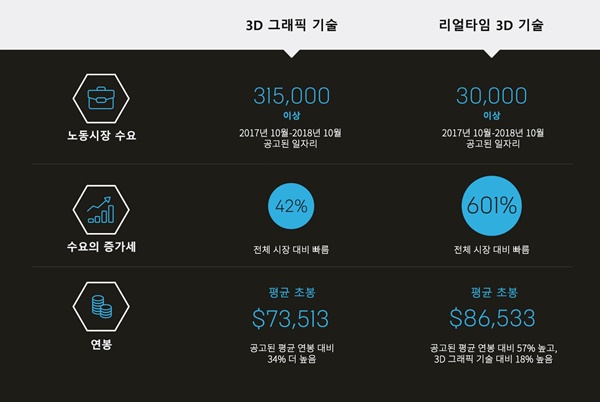 3D 그래픽 기술 직종 중에서도 특히 리얼타임 3D 기술과 관련된 일자리의 증가세가 눈에 띄게 높았는데, 일자리는 3만개가 넘는 것으로 나타났으며, 일자리 증가세는 전체 시장 대비 601%라는 압도적인 수치를 보였다. 평균 초봉 역시 약 8만6000달러(한화 약 1억200만원)로, 공고된 평균 연봉 대비 57%, 일반적인 3D 그래픽 직종보다는 18% 더 높았다.