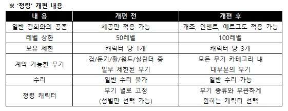 현재도 많은 유저들에게 사랑받고 있는 콘텐츠 ‘정령 무기’는 더욱 개선된 모습으로 새롭게 선보일 예정이다. 먼저, 한 무기에 정령 계약, 개조, 인챈트 등 강화가 동시에 가능하도록 개편하고, ‘정령 무기’로 계약할 수 있는 무기의 종류와 수량을 대폭 추가한다. 또한, 무기의 종류에 얽매이지 않고 원하는 정령과 계약을 맺을 수 있으며, 여러 개의 정령 무기를 동시에 소유할 수도 있게 된다. 뿐만 아니라, 육성 및 성장 방식에 선택지를 부여해 원하는 무기로 강화할 수 있고, 레벨 한계를 확장하는 동시에 육성 난이도는 낮춘다.