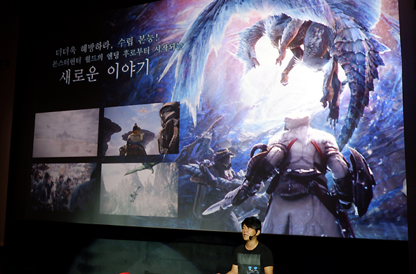 캡콤의 츠지모토 료지 프로듀서는 25일 서울 강남구 청담 CGV에서 진행된 ‘몬스터헌터 월드 아이스본’ 미디어 쇼케이스에 참석했다. 그는 이날 9월 6일 출시 예정인 ‘몬스터헌터 월드 아이스본’의 신규 지역과 몬스터를 소개하고 직접 게임을 시연해 보였다.