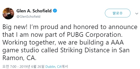 호러 슈팅게임 ‘데드 스페이스’의 핵심 개발자이자 슬레지해머게임즈를 공동 설립했던 글렌 스코필드(Glen Schofield)는 26일(현지시각) 자신의 트위터를 통해 펍지주식회사 합류를 공식화했다. 그는 “나는 이제 펍지주식회사 소속이라는 것을 발표하게 되어 자랑스럽다”며 “펍지와 나는 미국 캘리포니아주 샌 라몬에 스트라이킹 디스턴스(Striking Distance)라는 AAA 게임 스튜디오를 만들고 있다”고 밝혔다. 이와 함께 자신의 프로필도 스트라이킹 디스턴스의 대표로 바꿨다.