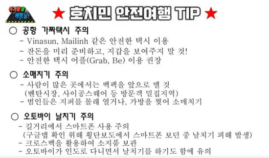 가령 공항 가짜택시 주의에는 그랩 등 안전한 택시 어플을 권장하고, 벤탄 시장, 사이공스쿠;어 등 사람이 많은 곳에서는 백팩을 앞으로 맬 것, 길거리에서 스마트폰 보던 중 날치기 피해 주의, 오토바이가 인도로 다니면서 날치기를 하기도 하니 주의를 요했다.