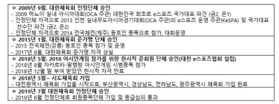협회가 대한체육회에 다시 입성한 것은 6개월 만으로, 지난 해 5월 대전e스포츠협회 설립으로 2018 아시안게임 시범종목 참가를 위해 대한체육회로부터 한시적 준회원 단체 승인을 받았으며, 이 자격이 2018년 12월 말 만료된 바 있다. 지난 2015년 1월에도 준가맹 단체 승인을 받은 바 있으나, 2016년 대한체육회가 생활체육협의회와 통합되면서 가맹 조건 개편으로 인해 2018년 1월 준회원 자격을 상실하기도 했다.