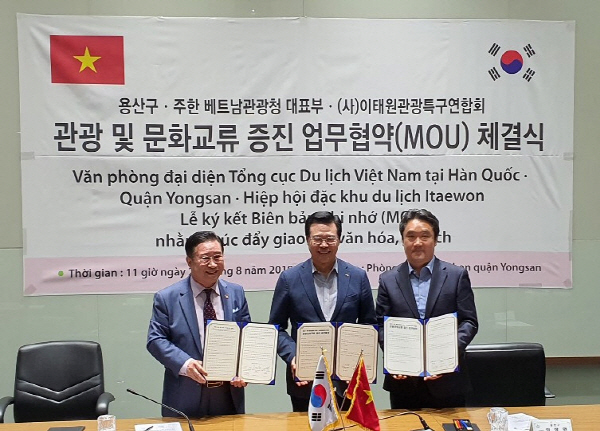 서울 용산구(구청장 성장현)가 지난 27일 구청 소회의실에서 주한베트남관광청(관광대사 리 쓰엉 깐), 이태원관광특구연합회(회장 조민성)와 함께 3자간 ‘관광·문화교류 증진을 위한 업무협약(MOU)’을 맺었다.