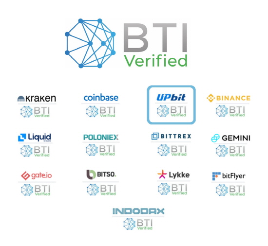 BTI에 따르면, 업비트는 미국의 대표 거래소들인 크라켄(Kraken), 폴로닉스(Poloniex), 코인베이스(Coinbase)와 함께 신뢰도 높은 거래소로 소개되었으며, 아시아 국가 거래소 중에서는 유일하게 언급됐다.