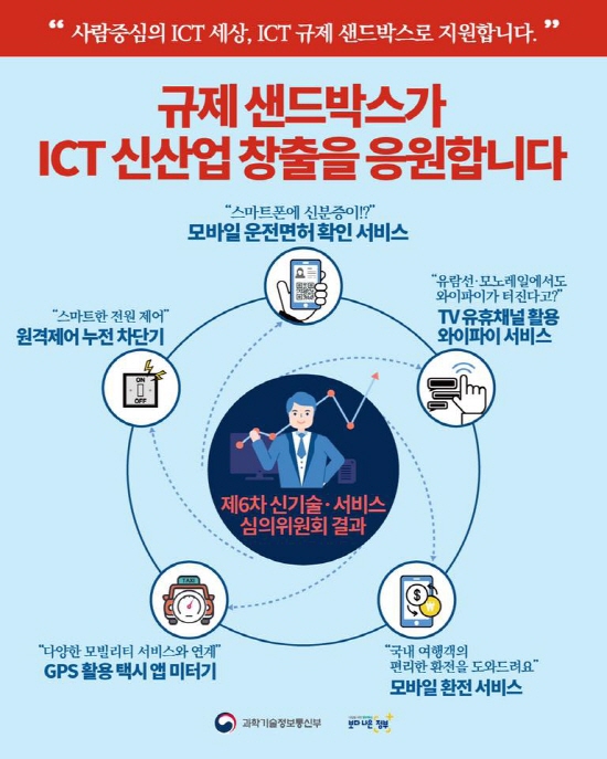 과학기술정보통신부는 26일 서울 중앙우체국에서 6차 신기술-서비스 심의위원회를 열었다. 11건에 대한 규제 샌드박스 지정여부를 심의한 결과 10건의 임시허가-실증특례 지정과 1건의 적극행정 권고가 있었다고 밝혔다.