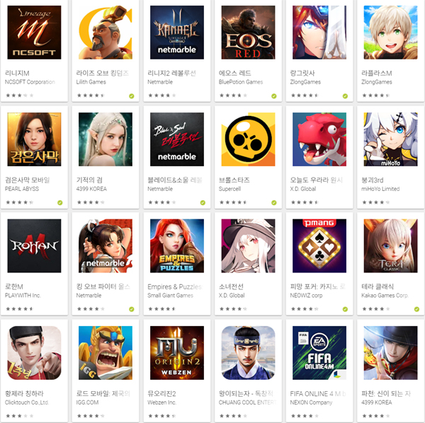 30일 구글플레이 스토어에 따르면 외산게임인 ‘라이즈오브킹덤즈’가 최고매출 2위를 기록 중이다. 이어 ‘랑그릿사’가 5위, ‘라플라스M’ 6위, ‘기적의 검’ 8위, ‘브롤스타즈’ 10위로 각각 뒤를 이었다. 매출 10위권 내에 있는 게임 중 국산 게임은 딱 절반인 5종이다.