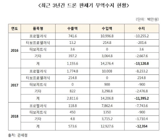 국회 과학기술정보방송통신위원회 소속 송희경 의원(자유한국당·비례대표)이 관세청으로부터 받은 ‘2016~2018 드론 완제기 무역수지’ 자료에 따르면, 드론 완제기 무역수지 적자는 2016년 131억에서 최고치를 달성하다 2017년 114억, 2018년 124억 적자를 기록한 것으로 집계됐다.