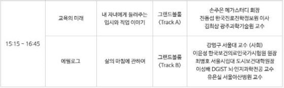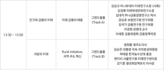 이어 ▲기업의 미래 ▲금융의 미래 ▲교육의 미래 ▲지방소멸시대 ▲웰다잉 등을 주제로 기업 최고경영자(CEO)와 학계, 금융계, 의료계, 교육계 관계자들이 주제 발표를 하고 열띤 토론을 벌일 예정이다.
