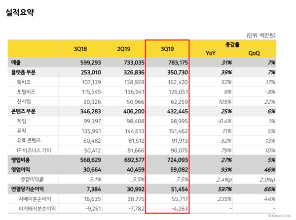 카카오(공동대표 여민수, 조수용)는 K-IFRS(한국국제회계기준) 기준 2019년 3분기 연결 매출 7,832억원, 영업이익 591억을 기록했다고 7일 밝혔다.