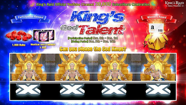 북미 및 유럽 등 영어권 커뮤니티에서는 ‘킹스레이드’의 타이틀 곡 'Blind Days' 커버 영상을 YouTube에 올리는 'King's God Talent'도 진행된다. 영어로 진행되는 이벤트지만 한국, 대만, 일본 등 전세계 킹스레이드 유저라면 누구나 참여 가능하다.