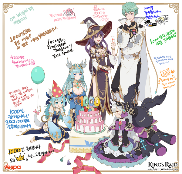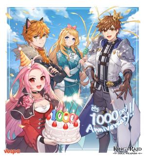 베스파는 ‘킹스레이드’ 정식 서비스 1000일을 맞아 긴 시간동안 사랑해준 유저들에게 보답하는 마음을 담아 7일간 특별한 선물을 게임에 접속한 모든 유저들에게 제공한다. 이와 함께 ‘킹스레이드’가 서비스되고 있는 국가별 커뮤니티에서는 1000일 기념 유저 축전 이벤트와 1000일 기념 아이템을 착용한 커스터마이징 이벤트 등 다채로운 이벤트가 진행된다.