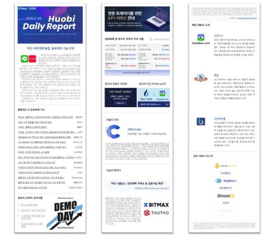 오늘의 이슈, 블록체인&암호화폐 이슈, 후오비 코리아 주요 공지사항, 암호화폐 주요 시황, 오늘의 코인, 오늘의 한마디 등 알찬 콘텐츠로 구성된다.