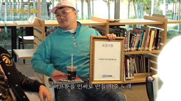 JK 김동욱과 작곡가 이창웅과 함께 출연한 데프콘은 이번 에피소드에 게스트로 참여했다. 특히 최근 버프툰 광고모델로 발탁된 데프콘은 버프툰 홍보에 적극 앞장서며 만화 마니아로서의 진가를 발휘했다. 버프툰의 서비스 정보와 다양한 혜택에 대해 설명을 들은 JK 김동욱과 작곡가 이창웅은 광고주 버프툰이 희망하는 ‘버프툰을 인싸로 만들어줄 노래’를 작사∙작곡하기 위해 회의를 거듭했다.