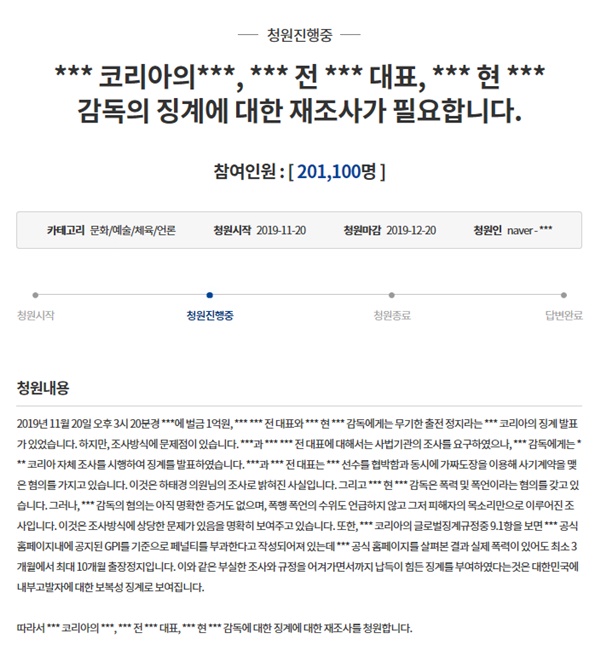 20일 청와대 국민청원 게시판에 올라온 조규남 전 그리핀 대표와 김대호 전 그리핀 감독의 징계 재조사 국민청원은 27일 오전 20만명의 서명을 모으는데 성공했다.