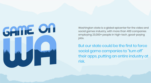 ‘Game On WA’는 워싱턴 주에서 소셜 게임 및 기타 무료 게임의 운영자가 합법적으로 게임을 운영 할 수 있도록 로비를 하기 위해 결성됐다. 이들에 따르면 워싱턴 주는 비디오 및 소셜 게임 산업의 진원지로, 400개 이상의 회사가 2만 3000명 이상의 직원을 고용하고 있다. 하지만 워싱턴 주 법률이 소셜 게임을 규제하는 움직임을 보이면서 수천개의 지역 일자리가 위협받고 있다고 주장했다.